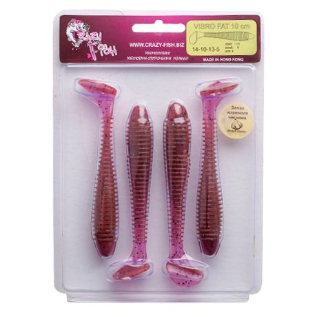 Crazy Fish Vibro Fat 4" — для лову великих щук, судаків та сомів. Головні переваги цього віброхвоста – об'ємне тіло та масивна п'ятка. Vibro Fat при роботі створює активну розмашисту гру і просто не може залишитися поза увагою зголоднілих хижаків. Ми зробили ідеальний баланс між міцністю та м'якістю силікону, додали до його складу найкращі атрактанти та солі для підвищення ефективності. Приманки досить "живучі" і не приходять у непридатність після кількох клювань, але при цьому матеріал дуже пластичний і дозволяє розкрити свій потенціал на всі 100%. Дозволить "умовити" навіть дуже пасивну рибу. У роботу включається при найповільніших проводках. Геометрія приманки добре підходить під оснащення всіма видами гачків: подвійними, офсетними та джиг-головками.