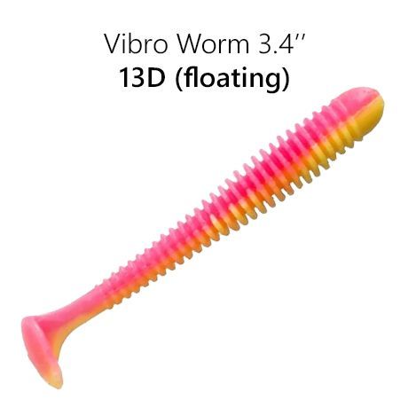 Плавающий Vibro Worm 3.4" —віброхвіст довжиною 8.5 см найпопулярнішої серед рибалок та риб форми. Його люблять усі: від окуня до щуки. Має стабільну високочастотну гру з малою амплітудою. Завдяки своїй прогонистій формі тіла, летить Vibro Worm дуже добре, тому він підходить для лову на будь-якій дистанції, навіть наддальній. Дозволить "умовити" навіть дуже пасивну рибу. Геометрія приманки добре підходить під оснащення всіма видами гачків: одинарними, подвійними та офсетними. Плаваючий матеріал в момент паузи утримує віброхвіст у вертикальному положенні, що є вагомою перевагою у ловлі настороженної риби.